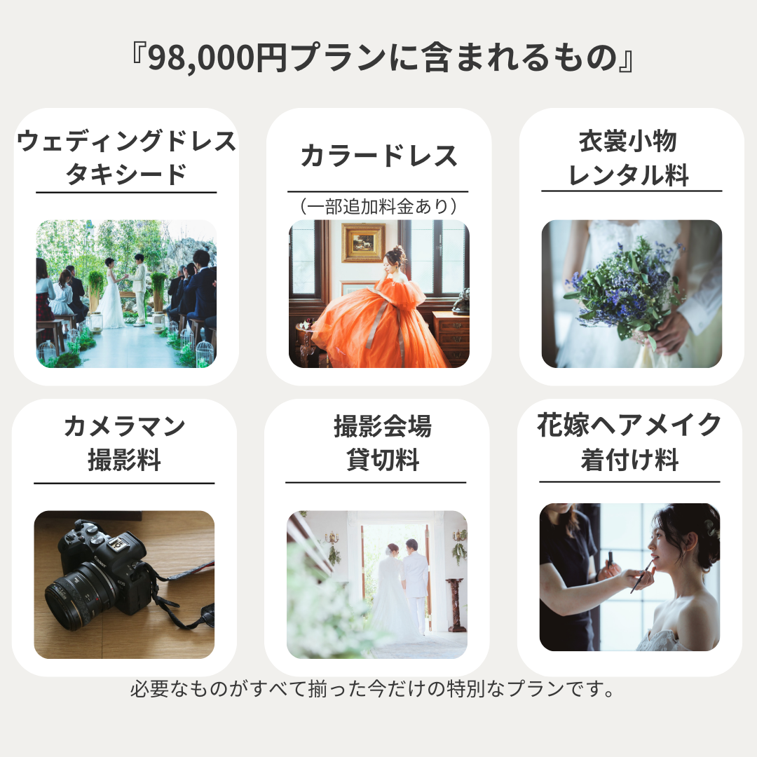 ウェディングドレス・タキシード・撮影料・衣裳小物レンタル料・ヘアメイク着付け・会場使用料・